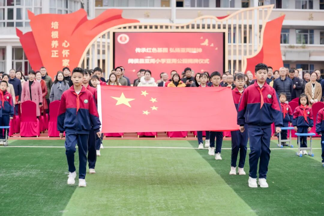随后,活动正式进入揭牌环节。在热烈的掌声中,中华全国归国华侨联合会副主席吴焕炎,省委统战部副部长李文慎,福州大学校友会会长陈国龙,省教育厅二级巡视员何光辉,全国政协委员黄毅辉,省妇联副主席陈婉萍,亚周小学荣誉校长陈聪聪,市委统战部副部长、市侨办主任林文福,香港海南社团总会执行会长詹汉钦,晋江市委常委、统战部部长丁鸿雨,亚周小学校长李新刚等领导与嘉宾共同移步至亚周公园,为公园揭牌。