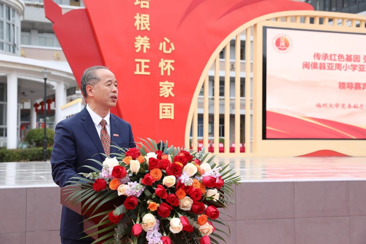 福州大学党委副书记王向阳致辞,他表示,自2010年福州大学与亚周小学共建以来,校友情缘持续深化。今天不仅是为公园剪彩,更是为这份跨越时空的校友精神与家国情怀致敬。他希望同学们站在先辈精神的基石上,以亚周先生、陈聪聪校长等前辈为榜样,汲取爱国、拼搏、担当与奉献的精神力量。珍惜时光,勤学修身,努力成为母校的骄傲、国家的栋梁。福州大学也将继续深化与亚周小学的合作,在科教文化等领域持续支持学校的发展,与大家携手将亚周小学建设为传承精神、培养新人的标杆,共同续写双向奔赴的育人新篇章。