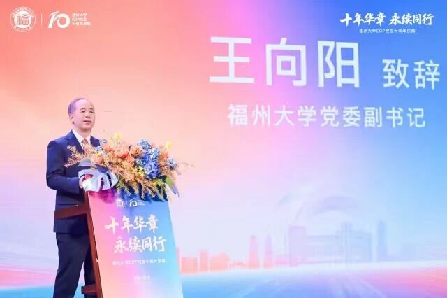 庆典上,福州大学校党委副书记王向阳代表学校致辞,他简单介绍了学校近年来的发展概况,向长期关心与支持母校发展的EDP校友表示感谢。王向阳副书记回顾了EDP校友十年来的不凡历程与卓越成就,并寄语EDP全体校友,应以十周年为崭新起点,继续秉承“明德至诚,博学远志”的校训精神,在时代浪潮中勇立潮头,与母校同心致远,共赴未来。