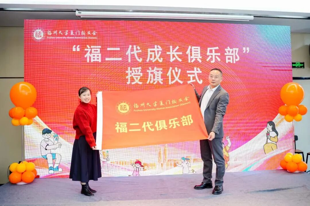 在全场热烈的掌声中,福州大学厦门校友会会长林泽权先生将绣有“福缘相传・二代启航”字样的俱乐部旗帜,郑重交予杨巧云部长手中。这面旗帜承载着校友们对子女成长的殷切期盼,寄托着无数家庭对美好未来的憧憬,此刻正式成为俱乐部扬帆远航的精神图腾,象征着传承与使命的接力传递。
