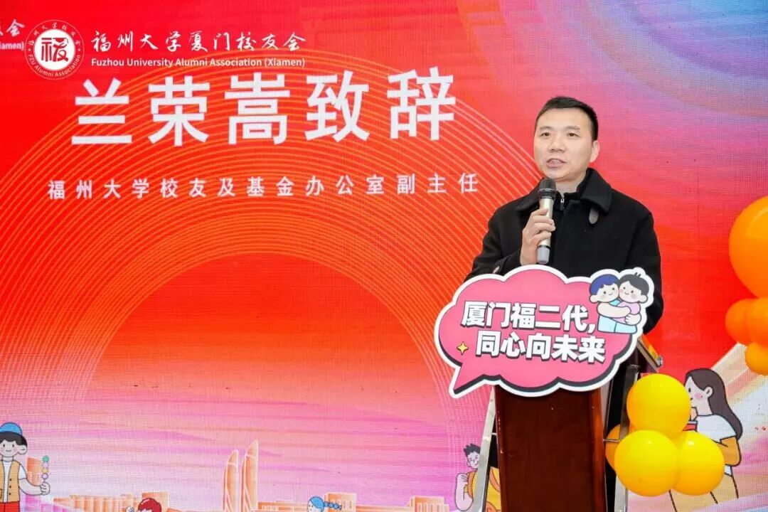 最后,福州大学校友及基金办公室副主任兰荣嵩先生代表校友总会致贺词。他盛赞“福二代成长俱乐部”的成立是“一项兼具战略眼光与人文温度的创举”,堪称连接福大精神传承与家庭情感培育、贯通校园学习与生活成长的爱心桥梁。兰主任明确表示,母校将在师资共享、课程开发、实践基地建设、研学项目设计等方面提供全方位、持续性支持,与校友们携手将这份关爱事业做实、做深、做久,让福大精神在下一代身上延续升华。
