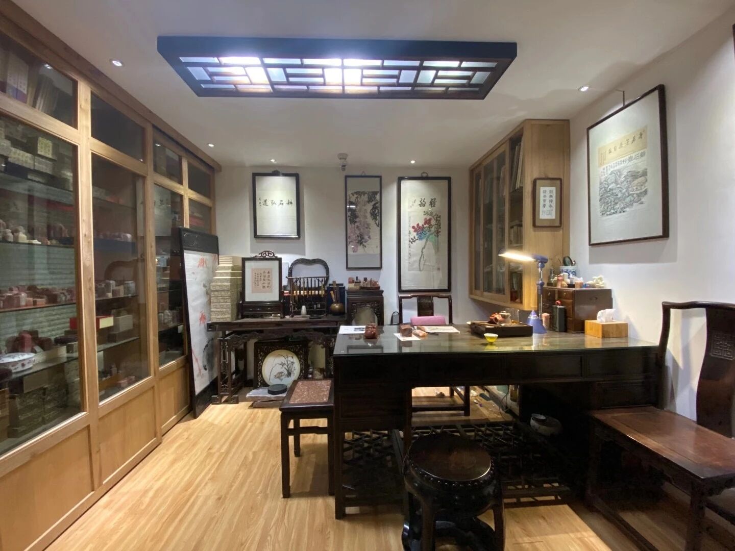 耕石寮只有十来平方米,两面墙是玻璃,陈设素朴,一张长桌是陈金光的工作台。没有访客的时候,陈金光左手握石,右手持昌硕刀,沉浸于方寸之间。